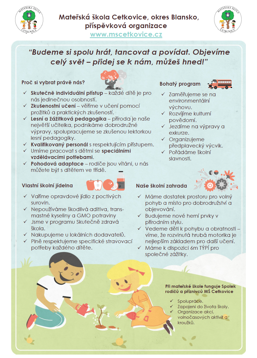 Mateřská škola Cetkovice leží v krásné přírodní krajině Malé Hané, kterou tvoří rozsáhlá nížina, úrodná pole, bujné louky a nádherná údolí. Škola je umístěna v blízkosti středu obce. Jedná se o dvoutřídní mateřskou školu s kapacitou 50 dětí.